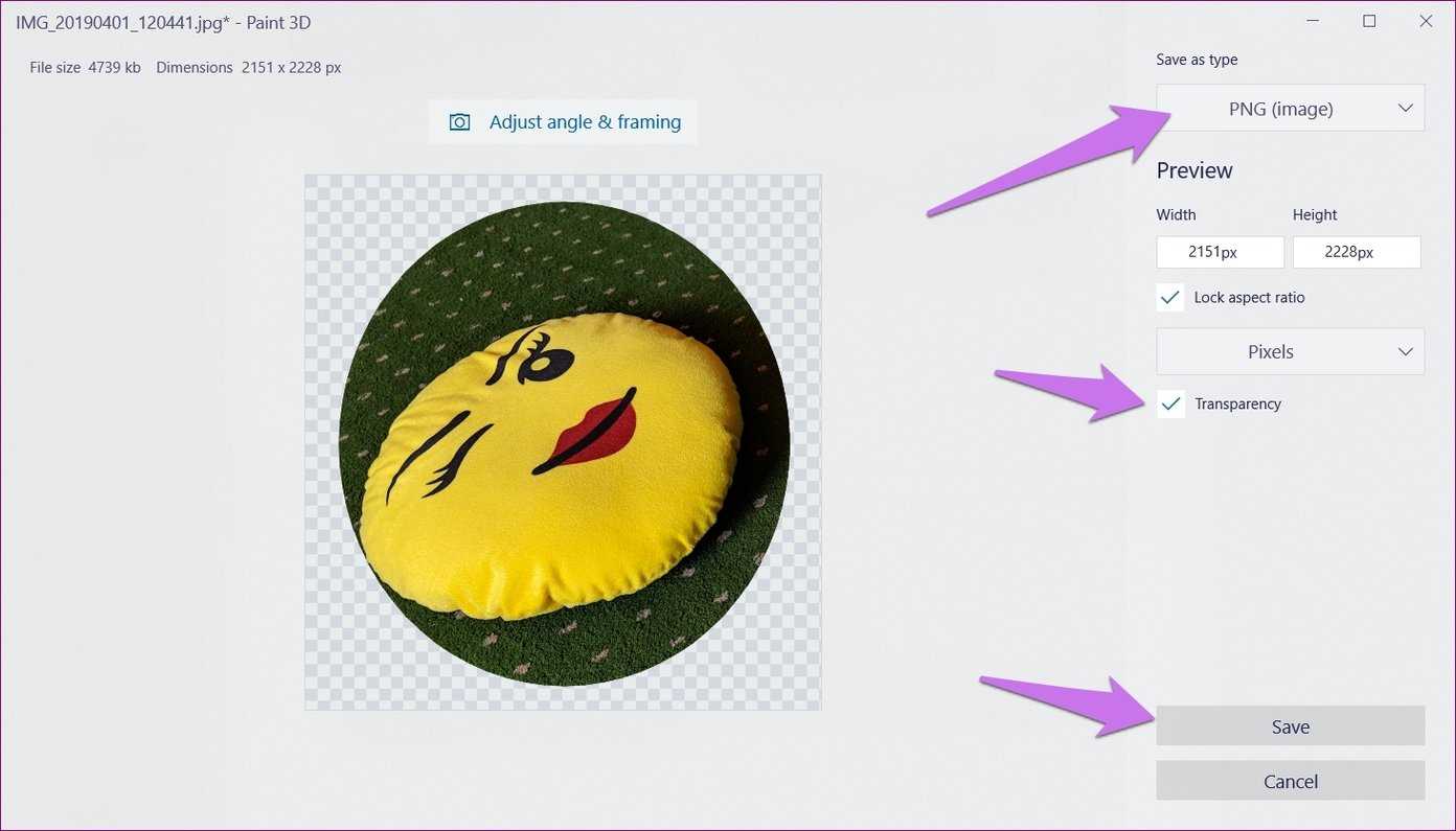 Шаг 6. В раскрывающемся списке «Сохранить как тип» выберите PNG (изображение) и установите флажок «Прозрачность». Нажмите кнопку Сохранить, чтобы сохранить обрезанное фото.