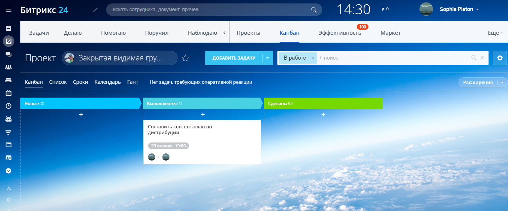 «Битрикс24» — это облачный сервис для совместной работы. Интерфейс на русском языке, есть десктопная и мобильная версии. Система объединяет в себе инструменты для управления проектами и аналог соцсети для сотрудников: