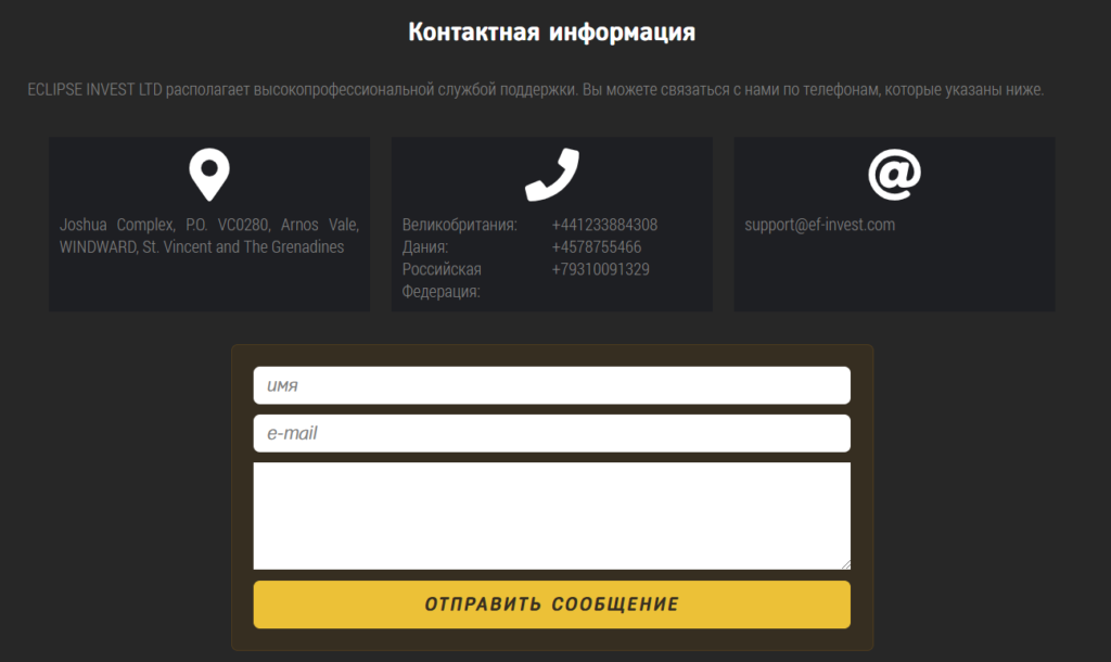 Брокер предоставляет горячую телефонную линию для Британских и Датских клиентов. Офис компании же находится в офшорной зоне, а именно в государстве Сент-Винсент и Гренадины. Но это не влияет на ведение брокерской деятельность в РФ и СНГ, ведь брокер обладает всеми нужными лицензиями для этого.
