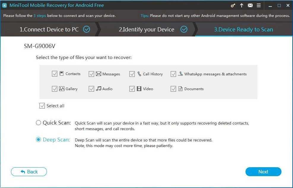 Быстрое сканирование быстро просканирует ваше устройство. Однако он поддерживает только восстановление удаленных контактов, коротких сообщений и записей вызовов.