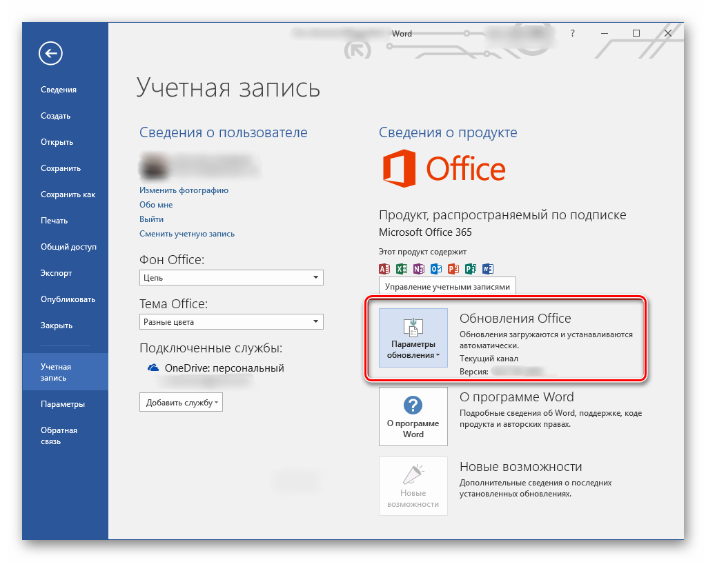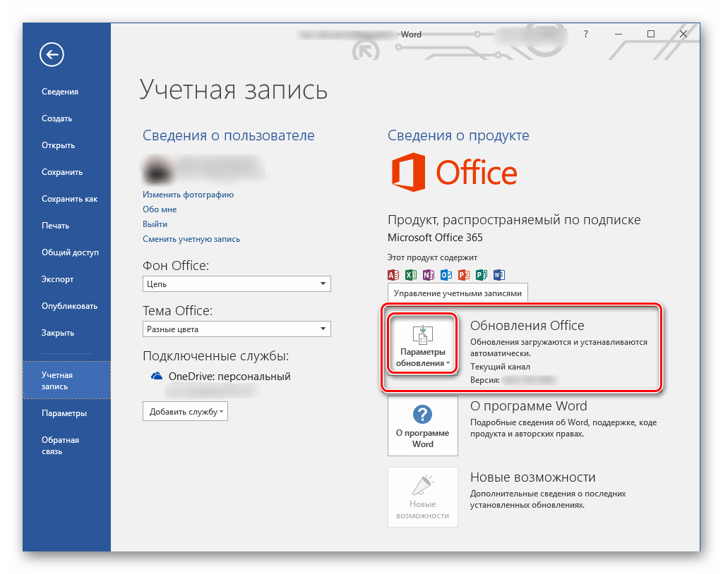 В разделе «Сведения о продукте» найдите кнопку «Параметры обновления» (с подписью «Обновления Office») и нажмите на нее.