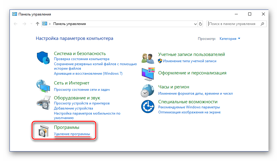 В появившемся окне найдите раздел «Программы» и кликните по расположенной под ним ссылке – «Удаление программ».