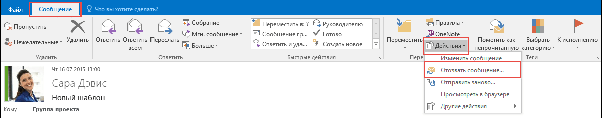 2В окне с ним переходим в пункт Сообщение, далее кликаем Действия и выбираем Отозвать сообщение….
