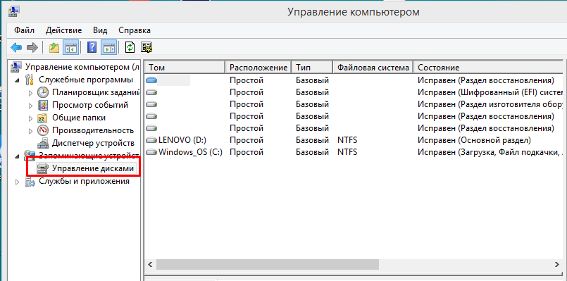 Нажимаем левой кнопкой мыши по подразделу «Управление дисками»