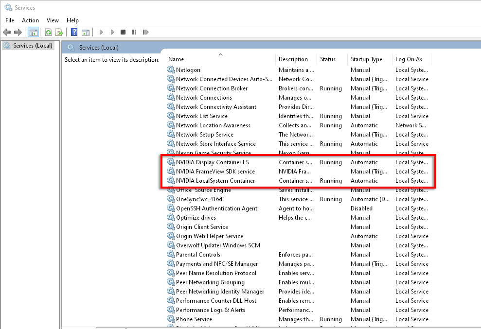 - Убедитесь, что запущены следующие службы: NVIDIA Display Container LS, NVIDIA Network Service Container и NVIDIA Local System Container.