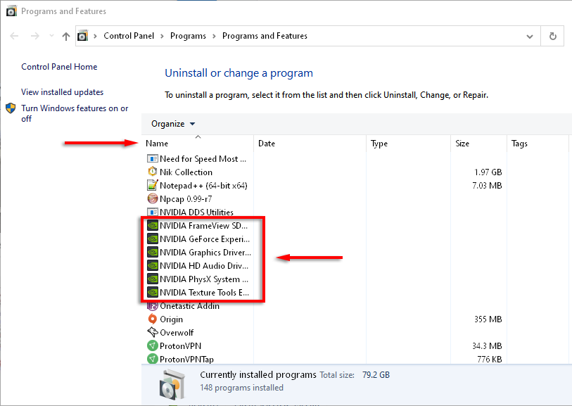 - Выберите «Имя», чтобы организовать столбец, затем найдите приложения NVIDIA.