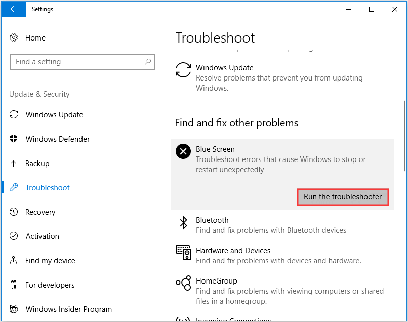 Шаг 2: Найдите Синий экран и выберите Запустите средство устранения неполадок .