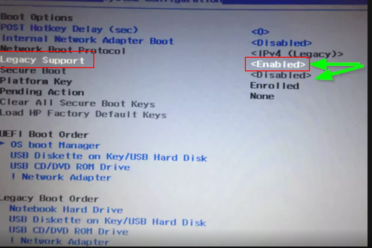 Все делаем правильно, попадаем в то самое меню ноутбука от HP, о котором я упоминал. Сразу жмем F10 — так мы попадаем в настройки БИОС, где нам нужно отключить загрузку UEFI, и включить загрузку с устройств — флешки, либо CD-DVD. По умолчанию эта функция (legacy) на заводе отключена; находим в меню биоса эти настройки и включаем их как на фото: