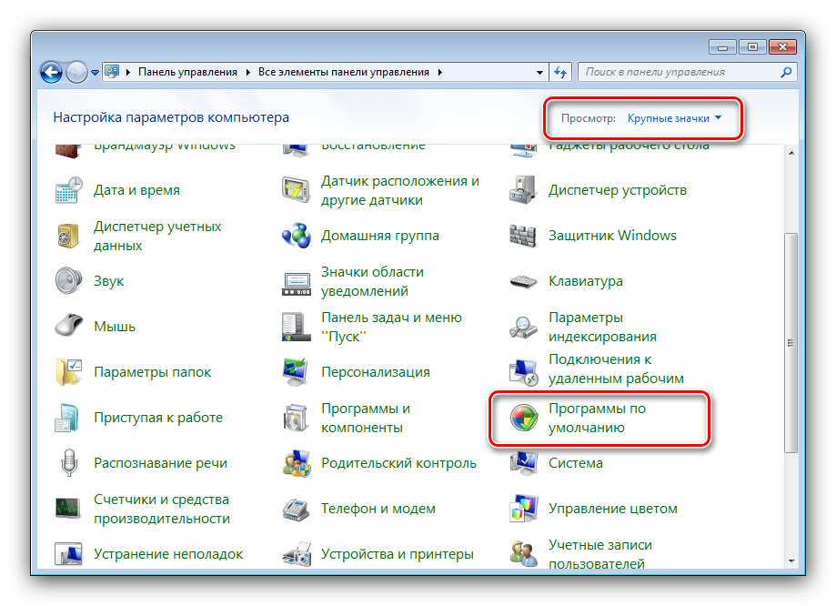 В «Панели управления» переключитесь на отображение крупных значков, затем перейдите к блоку «Программы по умолчанию».