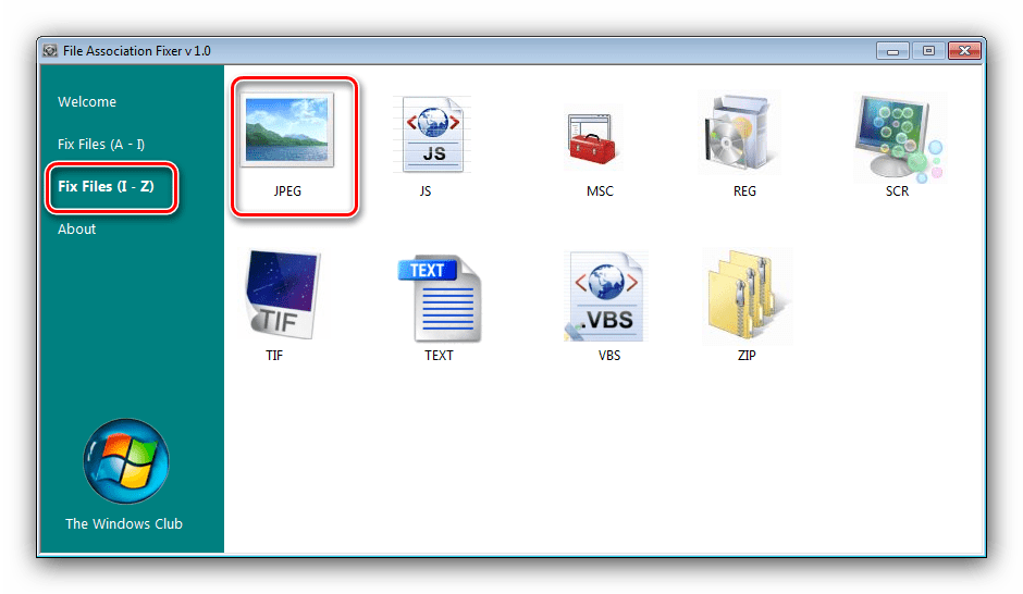 Для примера будем менять ассоциацию фотографий JPEG – нужный тип находится под ссылкой «Fix Files (I-Z)». Далее кликаем по иконке требуемого файла.