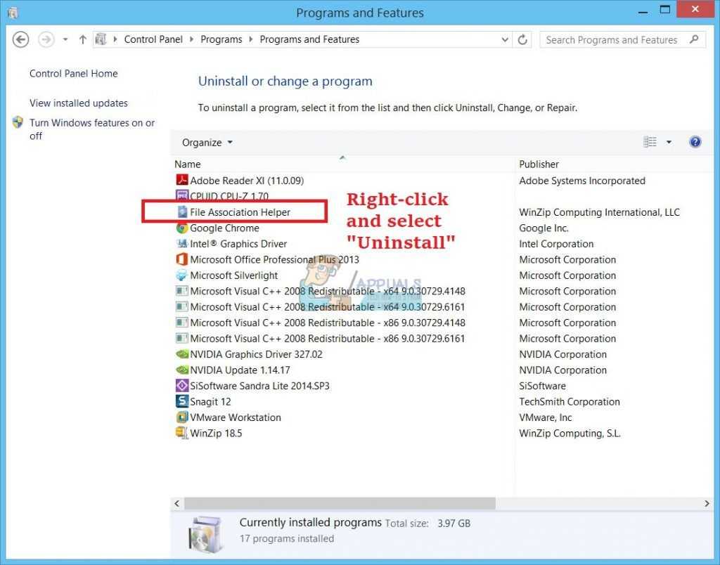 - Затем перейдите к Удалить программу > найдите помощника по сопоставлению файлов в списке и выберите его.
