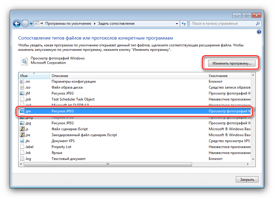 Подождите, пока система подгрузит список распознанных форматов, затем воспользуйтесь им для выбора нужного типа: выделите его, после чего нажмите «Изменить программу…».
