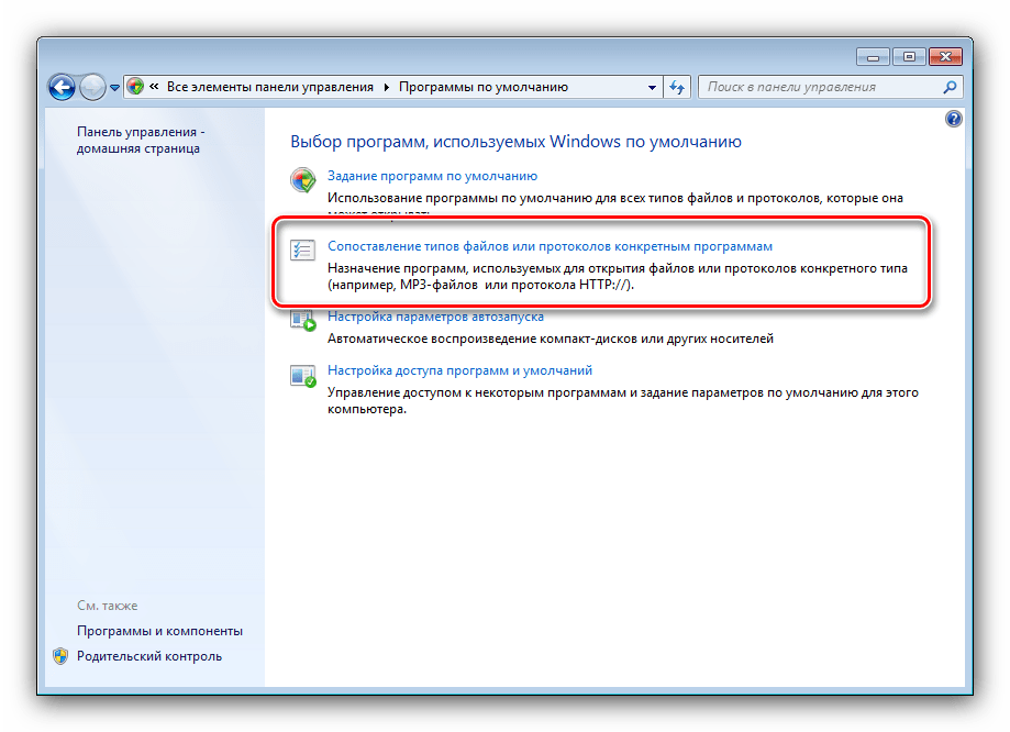 Нужный нам вариант называется «Сопоставление типов файлов или протоколов конкретным программам» – кликните по одноимённой ссылке.