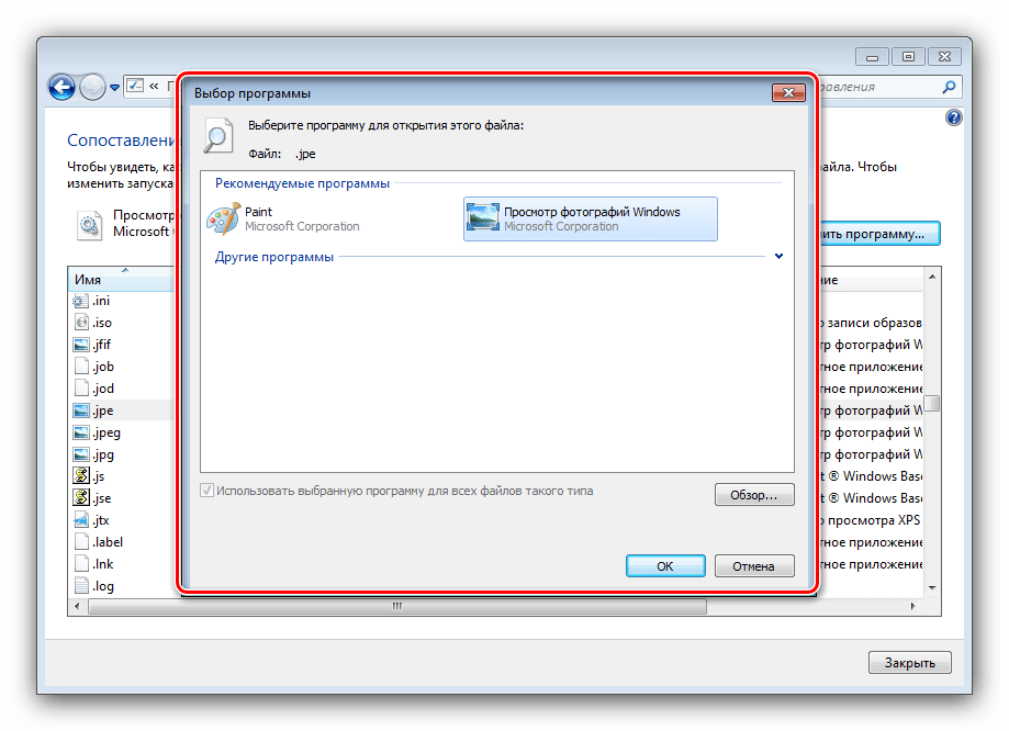 Для того, чтобы сменить или восстановить ассоциации файлов, выберите из списка рекомендуемых программ нужную, если ее тут нет, то вам необходимо нажать Обзор и сразу выставите галку Использовать выбранную программу для всех файлов такого типа.