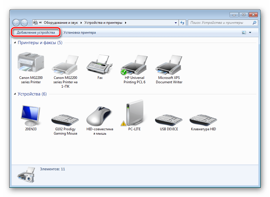 Операционная система Виндовс имеет несколько встроенных инструментов, позволяющих работать с печатным оборудованием. Процесс установки принтера через штатную возможность был рассмотрен в статье об инсталляции драйверов, ссылка на которую указана в первом методе. Однако иногда такая функция не подходит и принтер не устанавливается. Тогда нужно воспользоваться инструментом «Добавление устройства». Через «Панель управления» перейдите в раздел «Устройства и принтеры», там нажмите на соответствующую кнопку и следуйте отобразившимся на экране инструкциям.