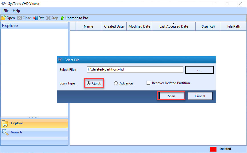 3: После того, Просматривать & Сканировать файл VHD: Быстро, Передовой & Режим удаленного раздела.
