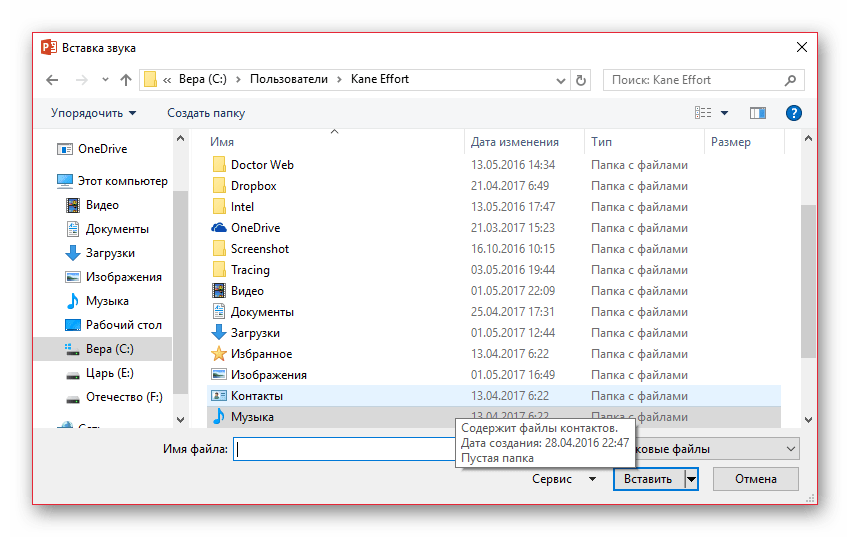 В проводнике найдите нужный музыкальный файл и щелкните Вставить.