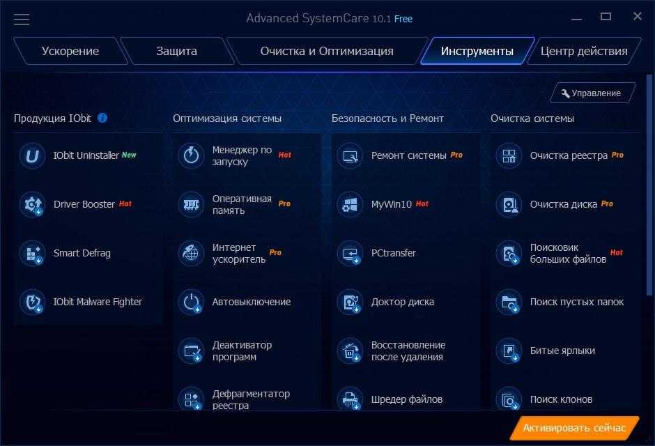 В «Инструментах» перечислены все модули приложения плюс другая продукция IObit.