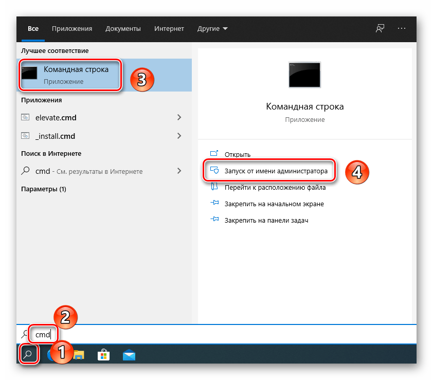 Во время рестарта снова возникнет окно с вариантами запуска. В нём просто нажмите «Enter». Войдя в систему, вызовите «Командную строку» от имени администратора. Для этого просто кликните на иконку поиска, введите запрос и выберите из появившихся результатов вариант, показанный на скриншоте цифрами 3 и 4.