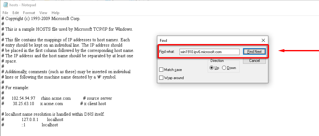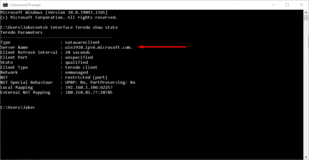 Обратите внимание на значение имени сервера, например win1910.ipv6.microsoft.com.