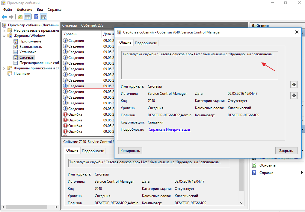 Открываем любую запись и смотрим причину сбоя: тип запуска службы «Сетевая служба Xbox Live» был изменен с вручную на отключена, это означает что я просто отключил эту службу, и в автоматическом режиме она у меня запускаться больше не будет, Windows не посчитал это грубой ошибкой поэтому и цвет ей предоставил светлый!