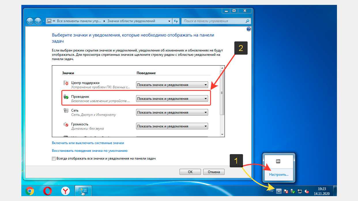 Если у вас Windows 7, то в области трея, нажмите на стрелочку и нажмите «Настроить», а в окне проверьте, чтобы у элемента «Проводник» было выставлено значение «Показать значок и уведомление». Если вдруг не так, исправляем.