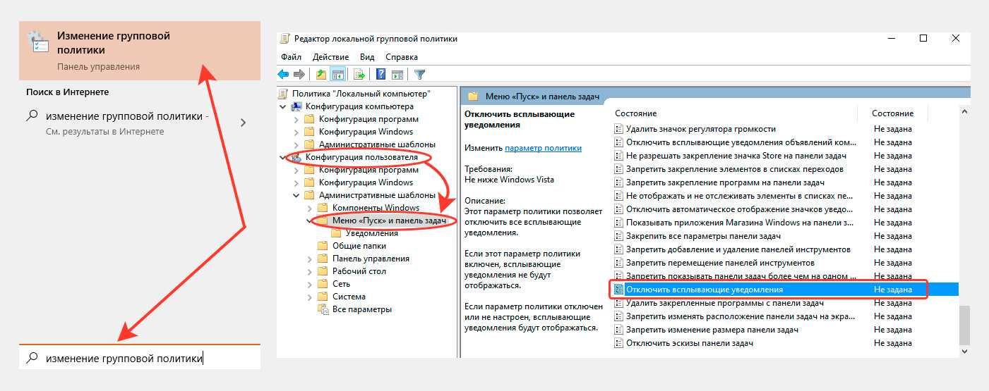 Вариант 2 — проверяем настройки параметров уведомлений и групповую политику