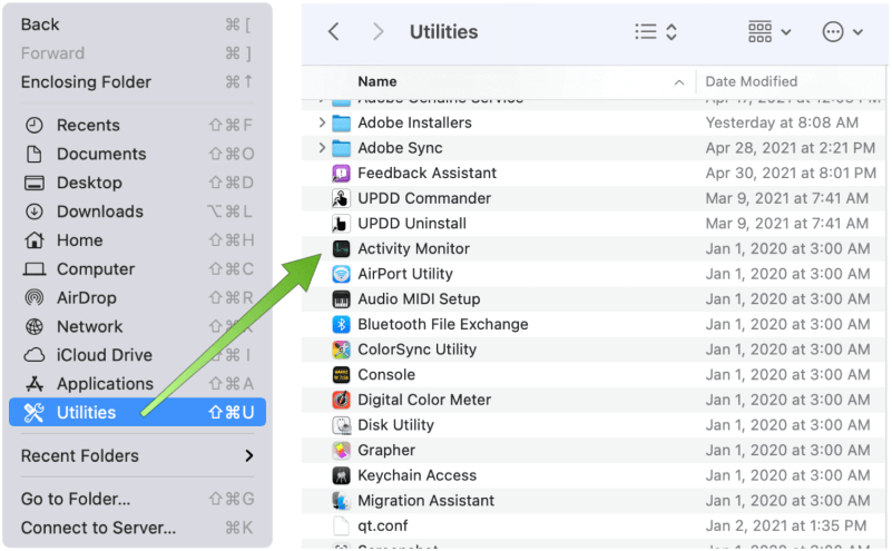 Несколько скрытый монитор активности показывает, что в настоящее время работает на вашем Mac. Более того, он показывает в графической форме, какие программы и процессы влияют на производительность вашего Mac. Вы можете найти Activity Monitor через Spotlight или меню Go для Finder в разделе Utilities. Монитор активности можно найти, щелкнув «Перейти» в строке меню Finder в папке «Приложения» в разделе «Утилиты». В инструмент включены три вкладки: ЦП, Память, Энергия, Диск и Сеть.