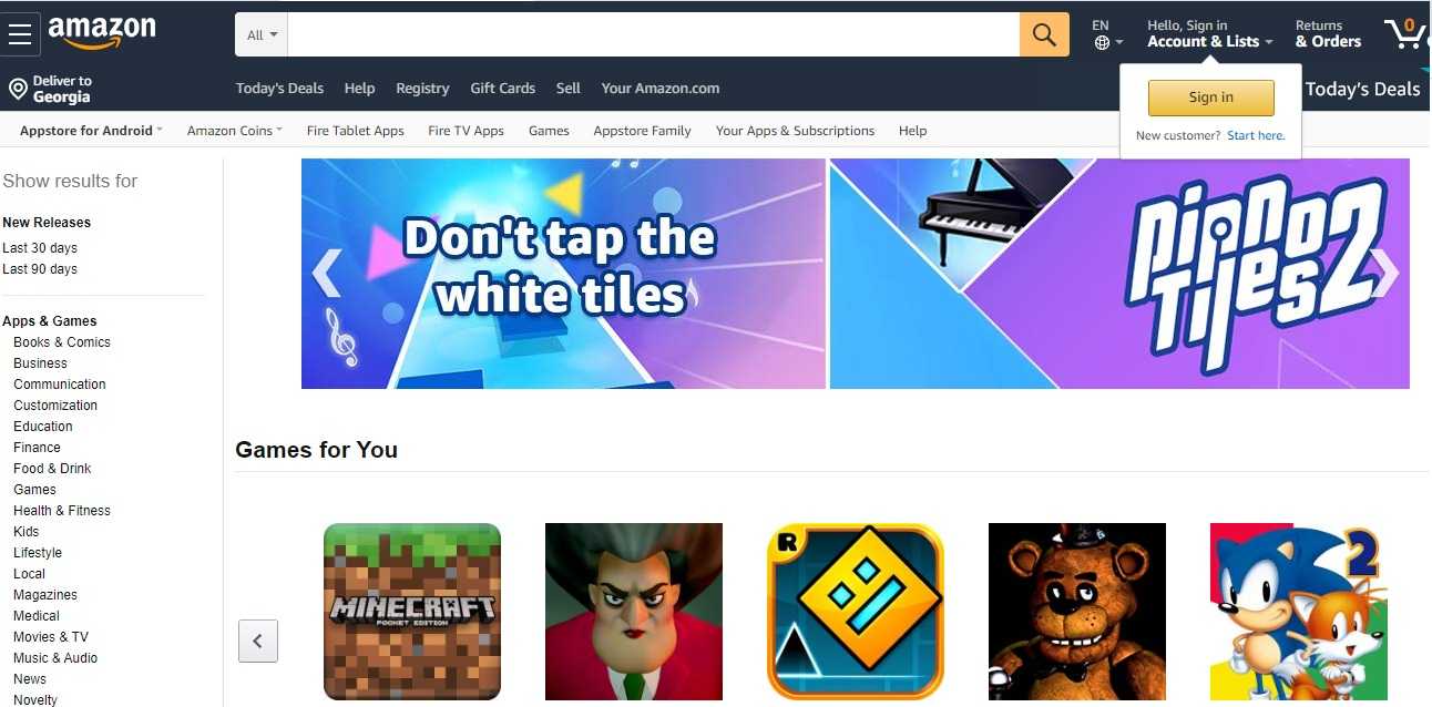 Amazon AppStore — третий по величине маркет. Он предлагает пользователям свыше 300 000 приложений. Политика компании отличается лояльностью, и потому многие разработчики могут легко выставить свое детище на продажу.