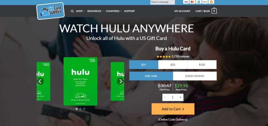 Что вы можете сделать по этому поводу? Это не легко получить американскую платежную карту, и это не легко получить учетную запись PayPal зарегистрированных в Соединенных Штатах либо. Каково решение? Лучшее решение, безусловно, заключается в том, чтобы купить один или несколько Hulu подарочные карты на MyGiftCardSupply. Ссылка приведет вас на свой сайт, место, где вы можете купить все виды подарочных карт, в том числе подарочные карты для Hulu в Соединенных Штатах.