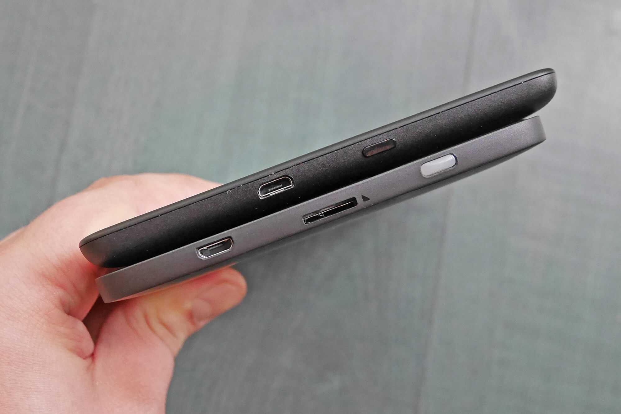 Ну и последнее, что стоит сказать о конструкции и дизайне ридеров. На нижних гранях обеих моделей находятся порты microUSB (ох, ну когда же производители читалок перейдут на Type-C!) и кнопки включения.
