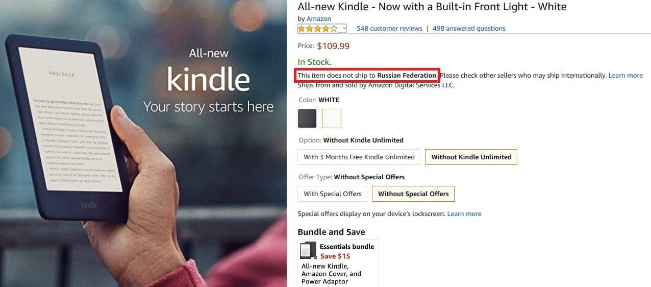 Ридеры Amazon, в отличие от PocketBook, не поставляются в Россию официально. При попытке заказа Kindle с указанием России в качестве страны доставки Amazon говорит, что это невозможно.