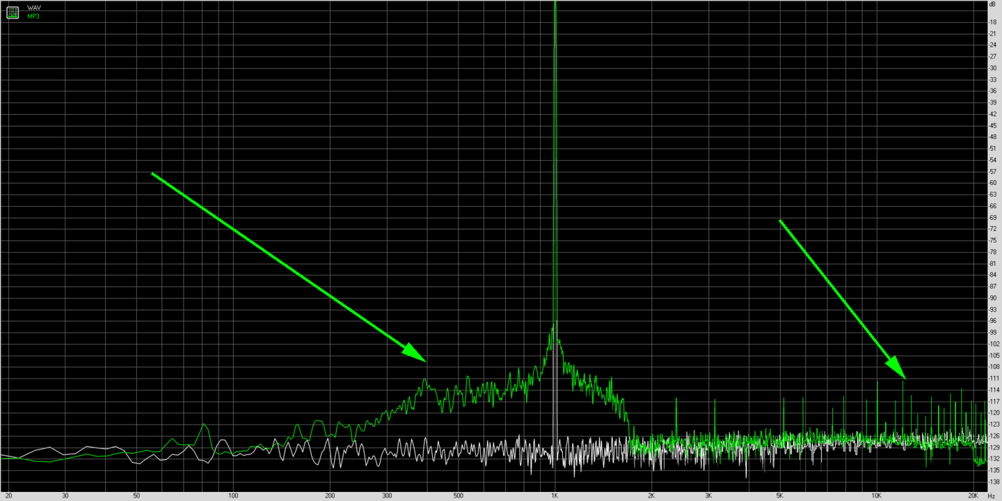 На самом первом рисунке было видно, что спектр в МР3 ожидаемо испытывает колебания в области ВЧ и окончательно отфильтровывается на границе 20 кГц. Разумеется, это предел синтетического теста, на реальном музыкальном сигнале она наверняка окажется еще ниже. Размеры динамического диапазона в МР3-файле не изменились по сравнению с оригиналом. Т.е. кодер LAME 3.100 на битрейте 320 кб/с не добавляет в запись никаких собственных шумов.