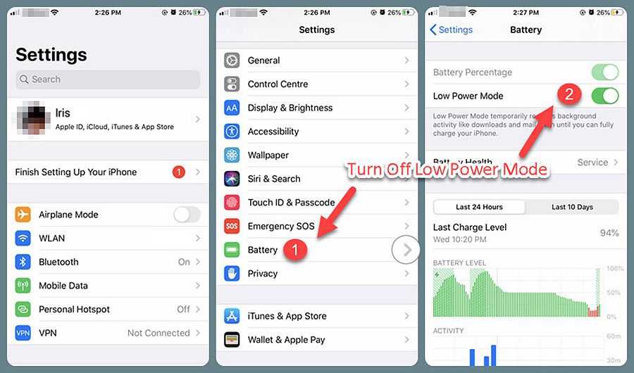 Условия эксплуатации: Включите Настройки на вашем iPhone> Прокрутите вниз до Батареи> Откройте страницу Батареи> Нажмите кнопку, чтобы выключить режим низкого энергопотребления.