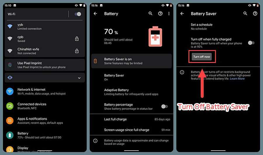 Условия эксплуатации: Включите Настройки на своих устройствах Android> Прокрутите вниз до Батареи> Войдите на страницу Батареи, и вы увидите Экономию заряда> Включите режим экономии заряда батареи и выключите его.