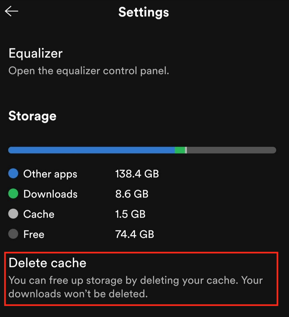На мобильном устройстве вы можете освободить место для хранения, очистив кеш в Spotify. Для этого перейдите в «Настройки»> «Хранилище»> «Удалить кеш».