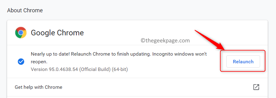 3. После завершения обновления нажмите кнопку «Перезапустить», чтобы снова открыть Chrome. Теперь проверьте, работает ли reCAPTCHA без ошибок.