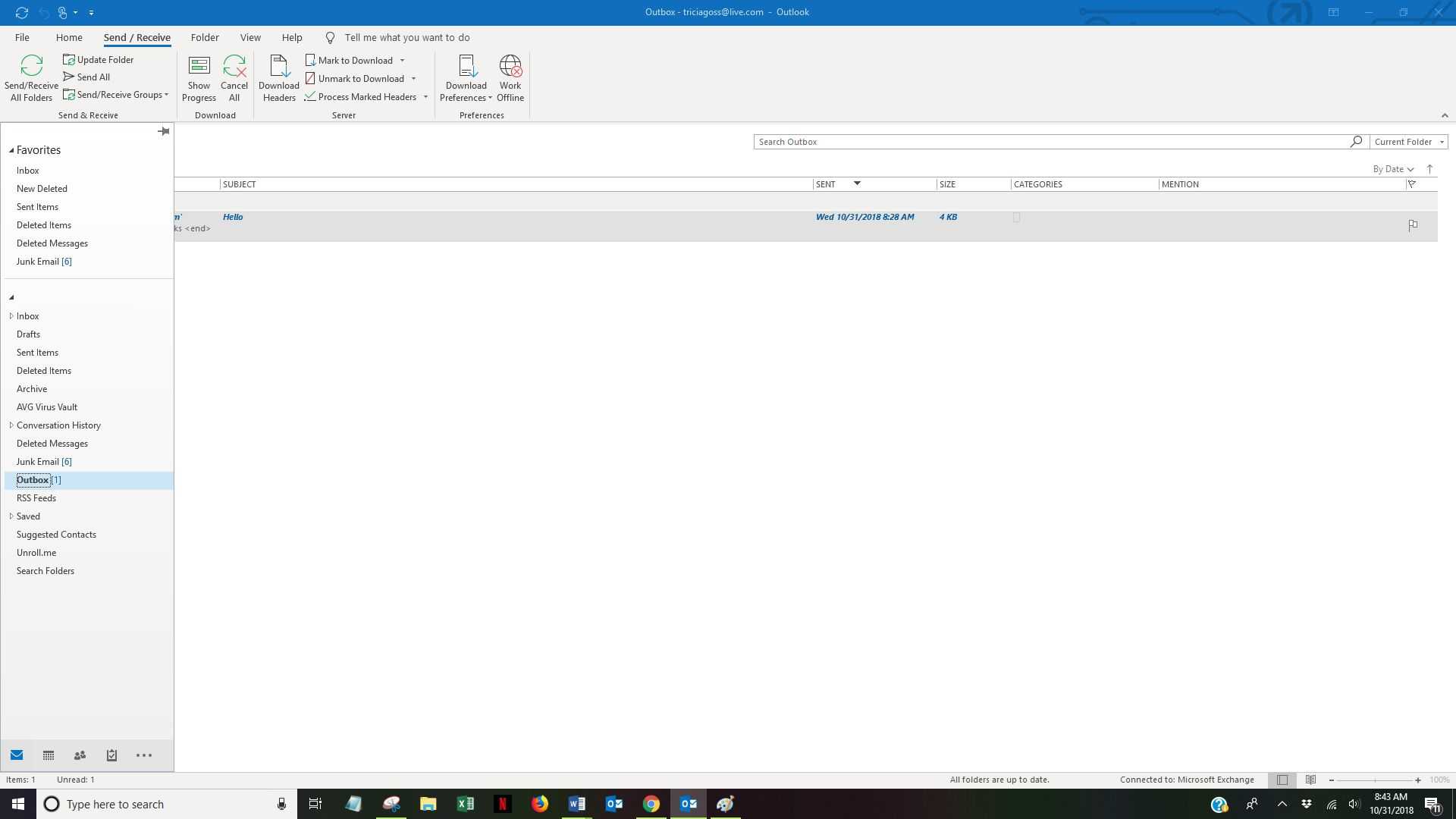 Нажмите кнопку Отправить / получить все папки» в верхнем левом углу окна Outlook или нажмите F9, чтобы попытаться отправить электронное письмо.