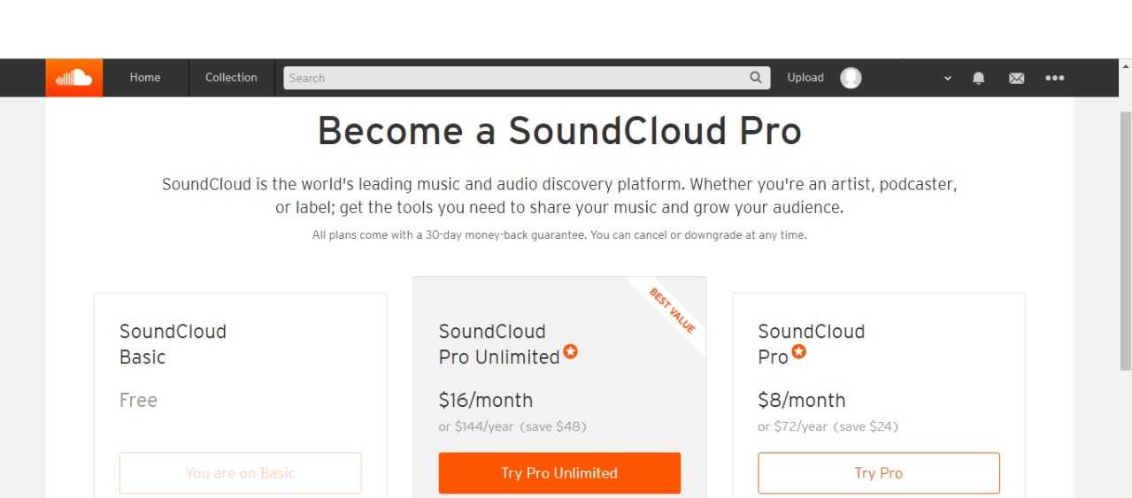 Соответственно, SoundCloud Pro является более ограниченной версией и включает в себя: