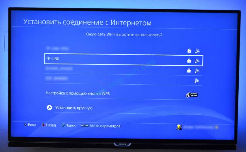 Чтобы подключить Плейстейшн 4 к Wi-Fi сети с помощью WPS, в окне со списком доступных сетей выберите пункт «Настройка с помощью кнопки WPS». После чего нужно будет активировать WPS на роутере.