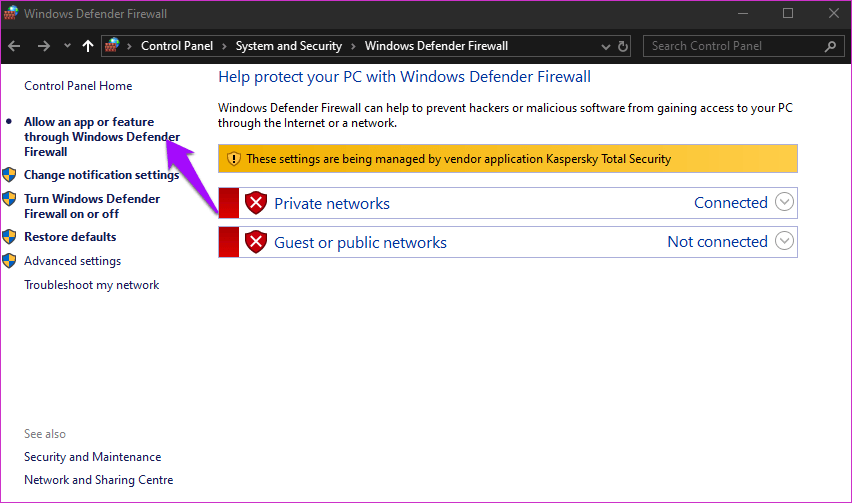 Если вы не можете найти запись Netflix в правилах для входящих подключений, вы можете создать новую. Для этого найдите и откройте брандмауэр Защитника Windows, который должен открываться на панели управления. Нажмите Разрешить приложение или функцию через брандмауэр Защитника Windows.