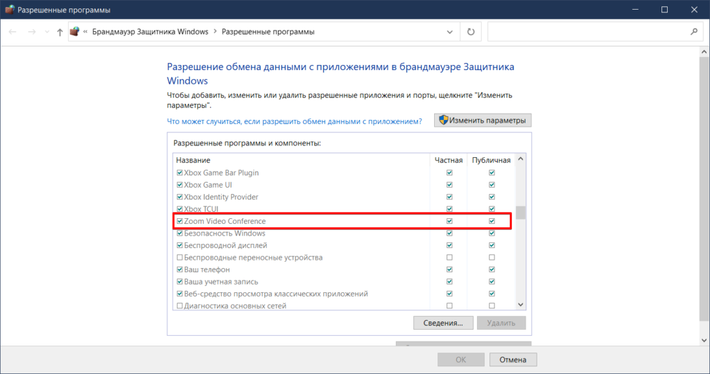 - Найдите Zoom Video Conference и установите флажки Частная и Публичная.