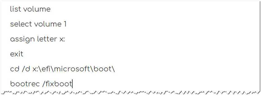 list volume select volume 1 assign letter x: exit cd /d x:\efi\microsoft\boot\ bootrec /fixboot