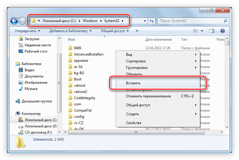 Как и в случае с Windows XP, причиной появления ошибки может стать отсутствие или повреждение в системе файла ntoskrnl.exe. Процесс восстановления этого файла точно такой же, как и файла hal.dll. Вам изначально нужно загрузить его на компьютер, после чего переместить в уже знакомую директорию System32, что находится по пути: