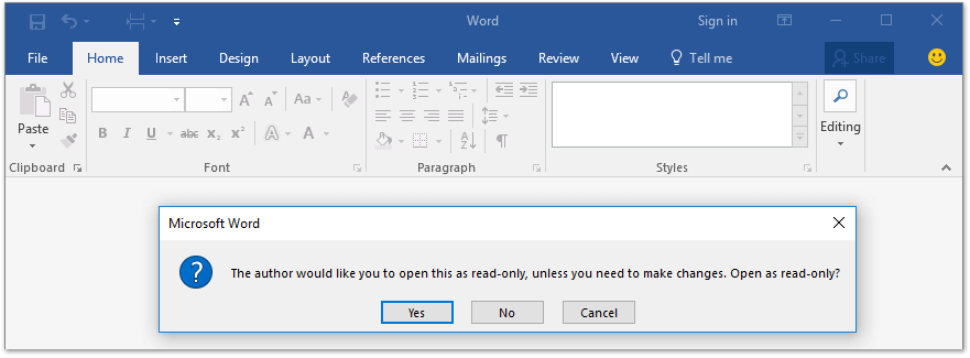 Когда вы откроете документ Word позже, появится диалоговое окно с сообщением, что этот документ Word доступен только для чтения, как показано ниже:
