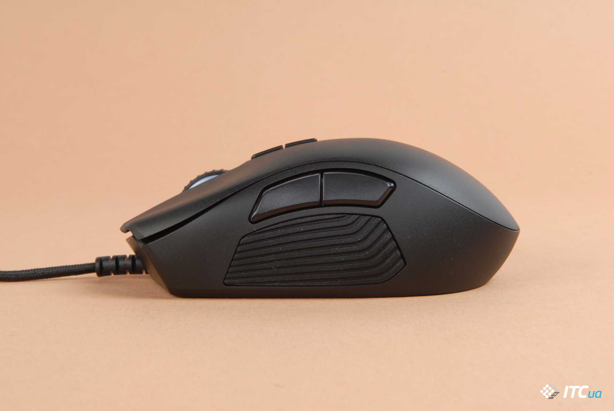 Правая сторона мыши имеет только 2 вещи: упор для пальцев и прорезиненную поверхность рядом для дополнительного хвата. Что касается левой стороны, она такая же, как у Scimitar от Corsair — девайс имеет сетку из 12 кнопок, которая, в отличие от Scimitar, является неподвижной.