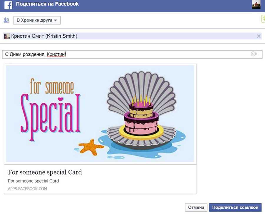 Есть вариант еще интереснее – виртуальные открытки. Конечно, ассоциируются они сразу же с Одноклассниками, однако, включив фантазию и проявив оригинальность, можно порадовать друга милым сообщением. Чтобы опубликовать открытку, нужно воспользоваться одним из десятков приложений, доступных на Facebook – Birthday Cards, Fun Cards, Happy Birthday Cards и многие другие. Кроме того, открытки можно скачать в фейсбуковских пабликах, а затем опубликовать на стене друга-именинника.