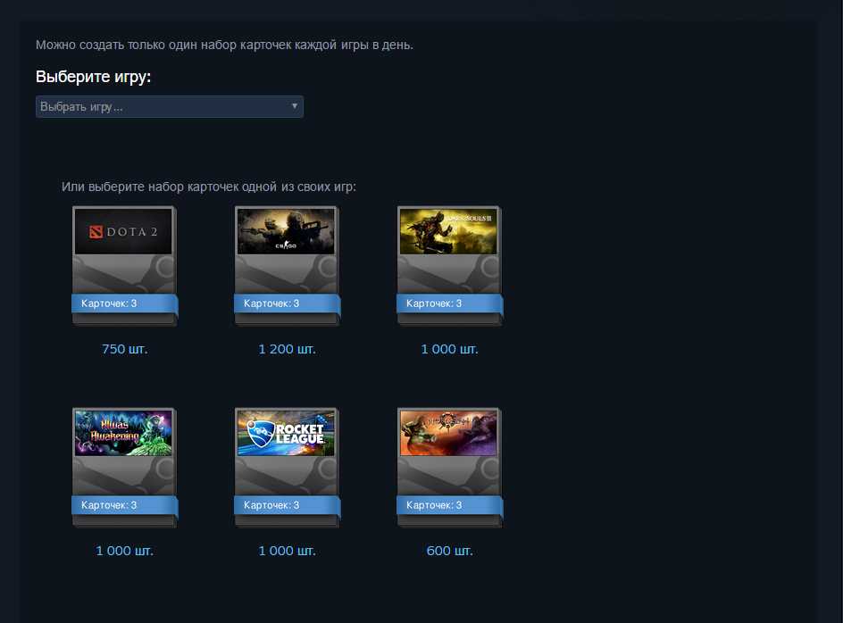 Обратите внимание, что для каждой игры число требуемых самоцветов для создания набора карточек резко отличается. К примеру, для той же КС:ГО нужно собрать 1200 самоцветов, чтобы скрафтить три карточки