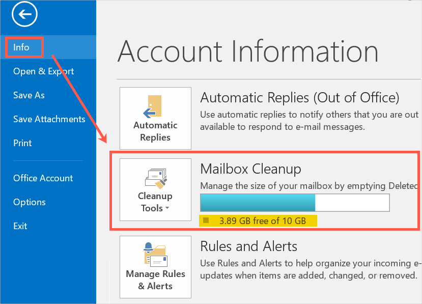 • Как правило, организации используют Exchange Server для отправки и получения электронной почты. Когда у вас есть гигабайты электронной почты, сервер обмена будет медленно синхронизировать электронную почту между сервером и вашим компьютером. Следовательно, у вас будет ограниченное пространство для хранения писем. В этом случае вам следует удалить или заархивировать электронные письма, чтобы освободить место.