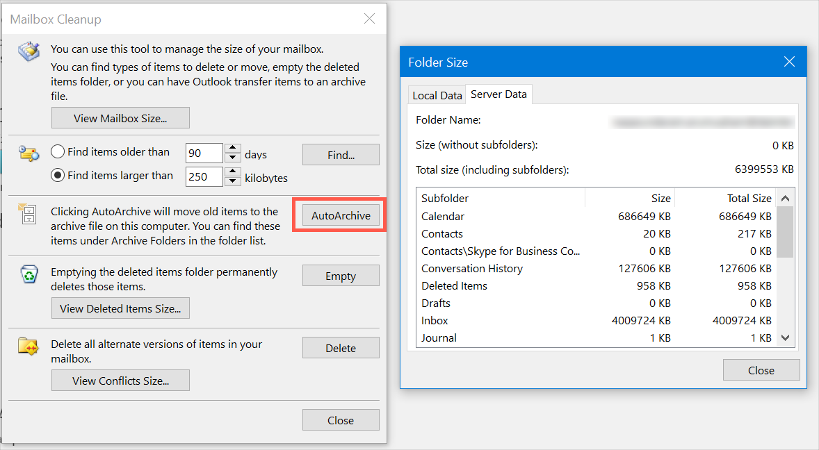 Вы можете увидеть различные варианты получения размера данных электронной почты во всплывающем окне «Очистка почтового ящика». Нажмите кнопку «Автоархивирование», чтобы открыть всплывающее окно «Размер папки».
